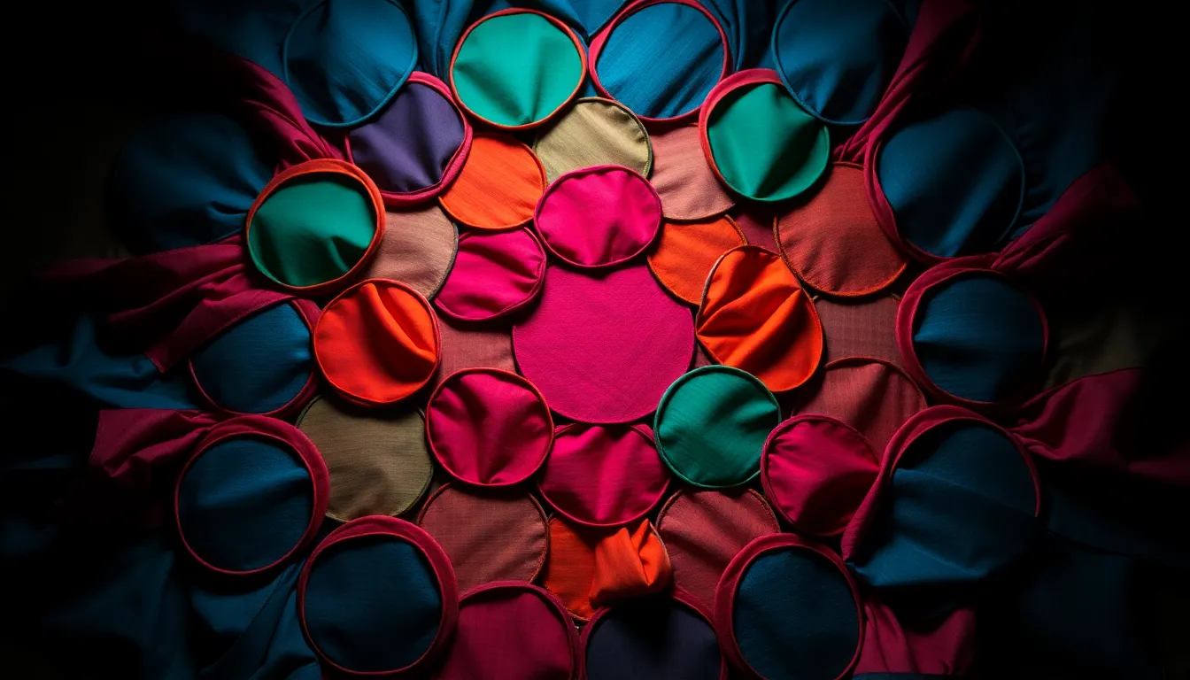 This image presents an intricate geometric pattern of interlocking circles made from colorful fabrics, vividly captured with a Canon lens. Dramatic studio lighting enhances the rich textures and colors, creating sharp contrasts that pop. The hyperfocal depth ensures clarity throughout, inviting viewers to appreciate the vibrancy of emerald, ruby, and sapphire hues. The centered symmetry of the composition accentuates the harmony of the design, making it a striking abstract piece.