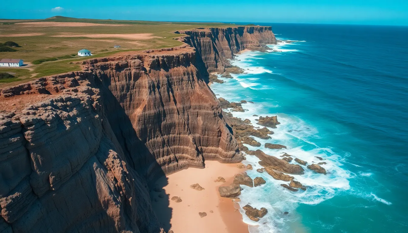 This breathtaking aerial photograph showcases a dramatic coastal cliffside, where turquoise waves crash against rugged rocks under the bright midday sun. The rich hues of the cliffs contrast beautifully with the deep blues of the ocean. With sharp focus from foreground to horizon, the image reveals intricate textures of the rocky surfaces and the dynamic movement of the foamy water. This scene encapsulates the raw beauty of nature and invites viewers to appreciate the seaside landscape.