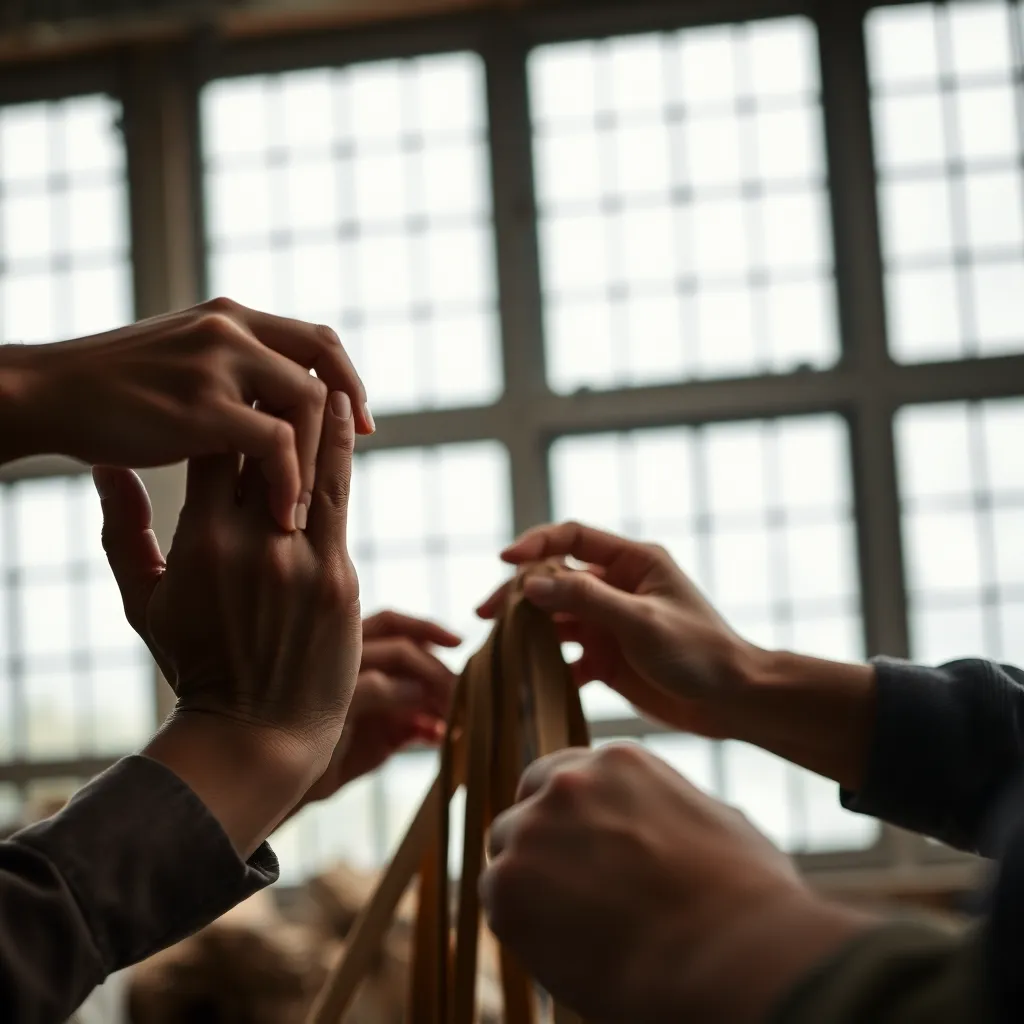 The image captures an intimate moment of teamwork, focusing on the hands of diverse individuals collaborating on an intricate project. The overcast daylight creates a soft, diffused light that highlights the textures of the materials being worked on, while the selective focus emphasizes the unity among hands. Natural muted tones enhance the peaceful ambiance, showcasing the dedication and creativity involved in teamwork.