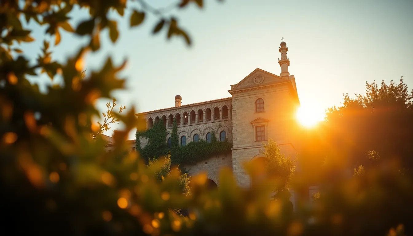 This captivating image depicts a historic landmark bathed in the soft golden light of sunrise. The warm tones create an inviting atmosphere, while the shallow depth of field emphasizes the intricate textured stonework of the building. Centered composition elegantly frames the landmark, accentuated by lush greenery in the foreground. The image evokes a sense of history and peace, inviting the viewer into this beautiful setting.