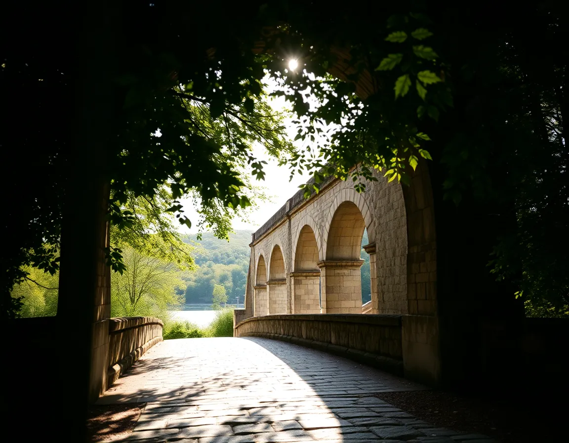 This breathtaking photograph showcases a quaint village cottage nestled amidst greenery, illuminated by dappled sunlight. The vibrant colors reminiscent of Fujifilm Velvia enhance the lush greens and earthy browns, inviting tranquility. The composition utilizes leading lines from the cobblestone path, drawing the viewer's eye toward the charming cottage. The soft textures of the path and the cottage evoke a sense of nostalgia and warmth.