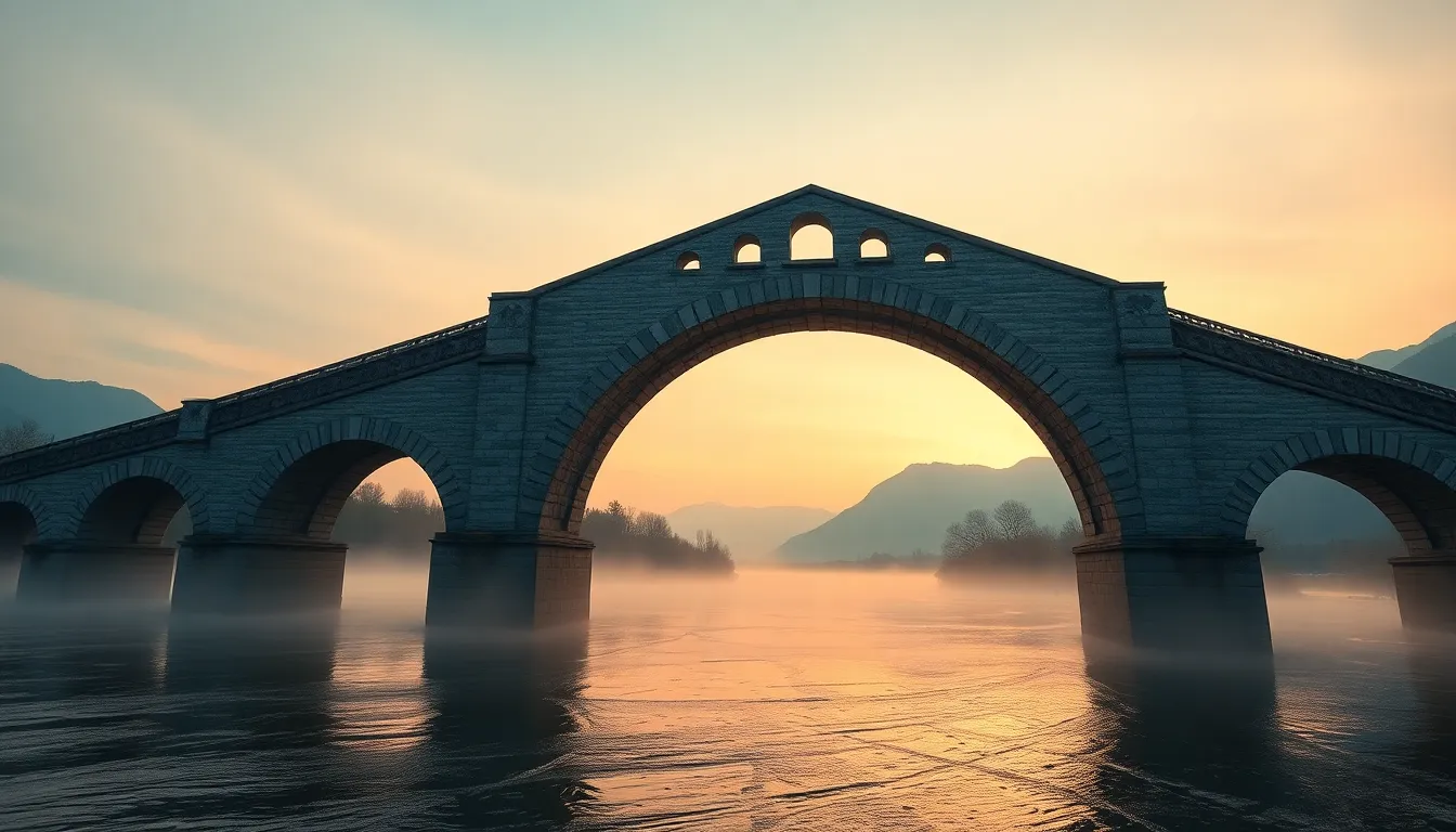 The scene beautifully captures an arched bridge at dawn, enveloped in soft pastel hues of the early morning sky. Mist rising from the tranquil river adds a serene touch, while the intricate stonework of the bridge is masterfully highlighted. The low angle perspective enhances its grandeur, and leading lines guide the viewer’s attention throughout the image. This photograph evokes a peaceful and majestic ambiance, perfect for capturing the essence of early mornings.