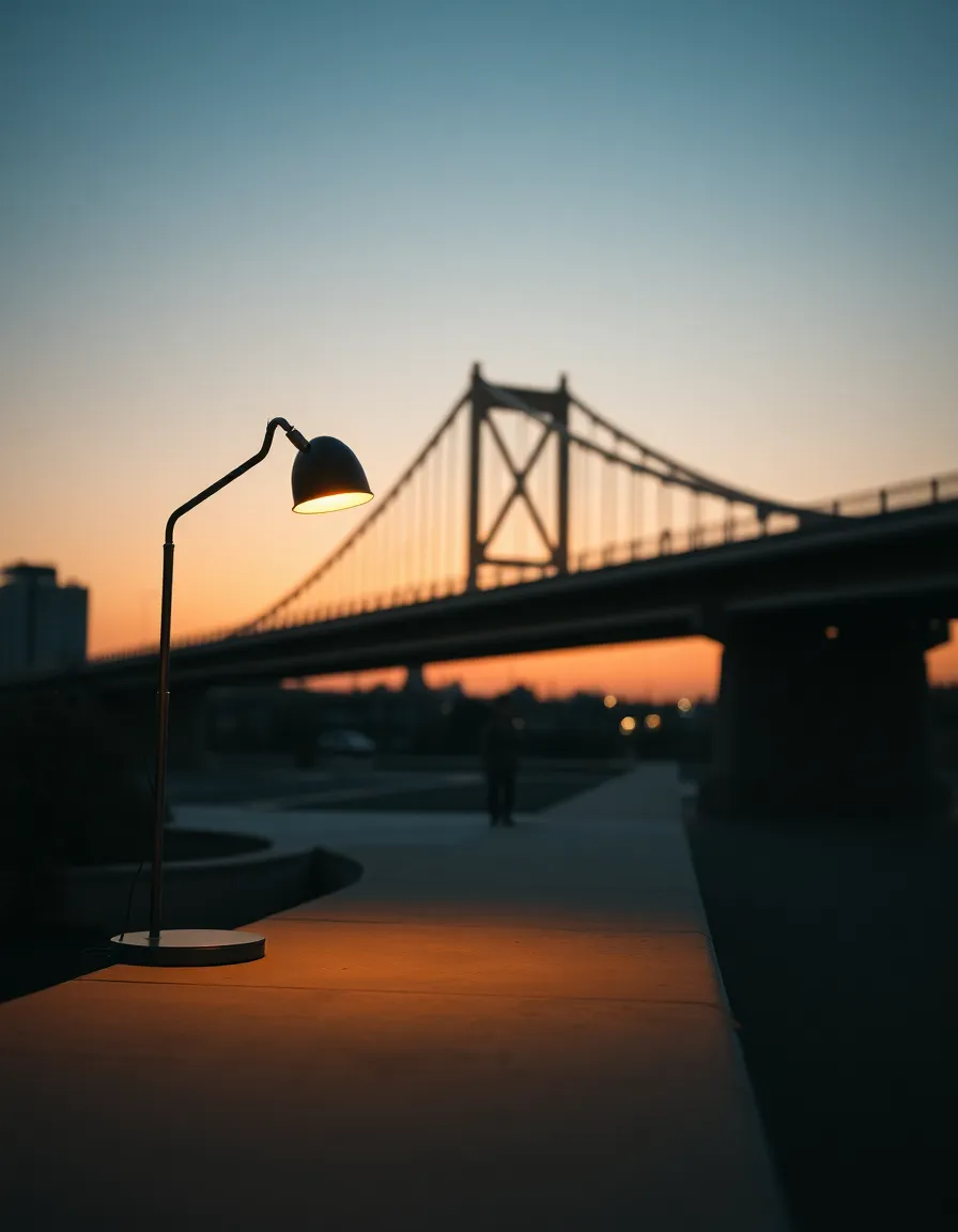 An ethereal twilight scene of a bridge illuminated by the soft glow of a warm tungsten lamp. The dreamy atmosphere is enhanced by the shallow depth of field, which focuses on the bridge while blurring the gritty urban surroundings. The smooth concrete contrasts beautifully with the surrounding textures, creating an inviting visual experience that draws the viewer in.