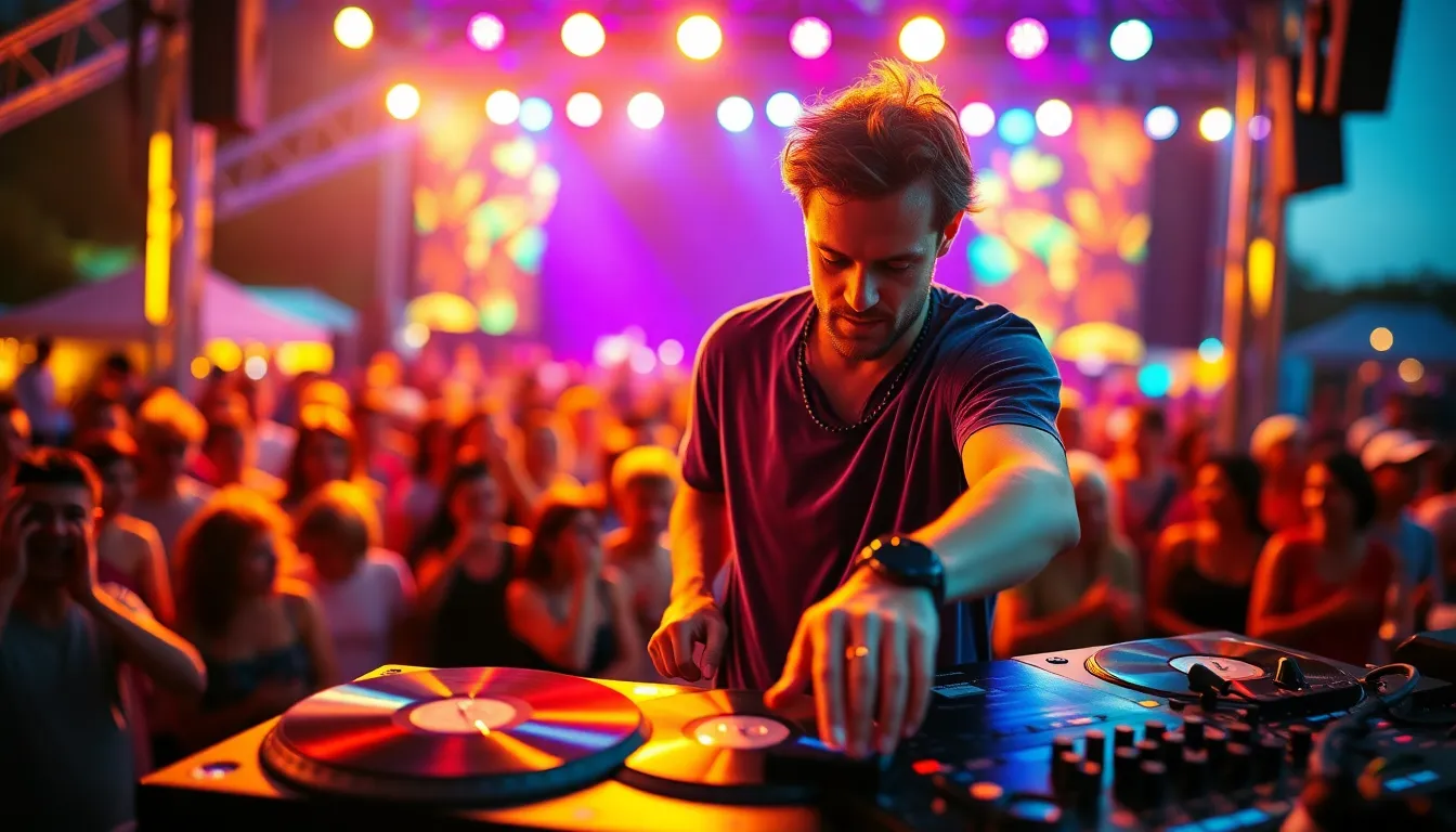 An exhilarating moment of a DJ performing live at an outdoor music festival, surrounded by colorful stage lights and an enthusiastic crowd. The warm golden hour light contrasts with the vibrant colors, creating a visually stunning atmosphere. The DJ's intense focus and energy are captured against a softly blurred backdrop of engaged fans, invoking the vibrant atmosphere of summer celebrations.