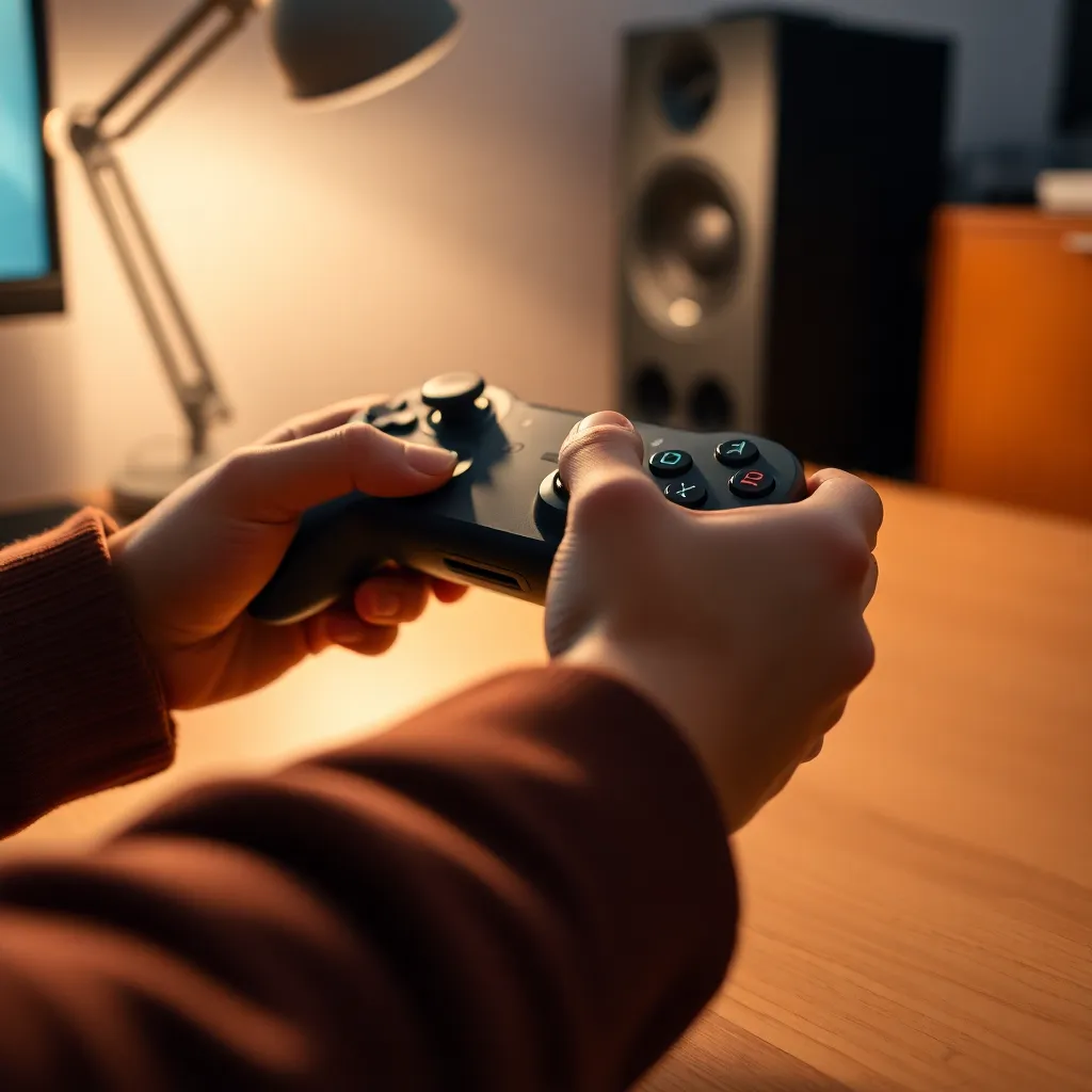 A captivating close-up of a gamer's hands expertly manipulating a high-end controller, set against a softly lit backdrop. The warm lighting accentuates the natural textures, revealing the intricate details of the controller and the subtle nuances of the gamer's grip. This image conveys a sense of intense focus and the thrill of competition, making the viewer appreciate the skill involved in gaming. The composition is tightly framed to emphasize the hands, creating an intimate connection with the viewer.