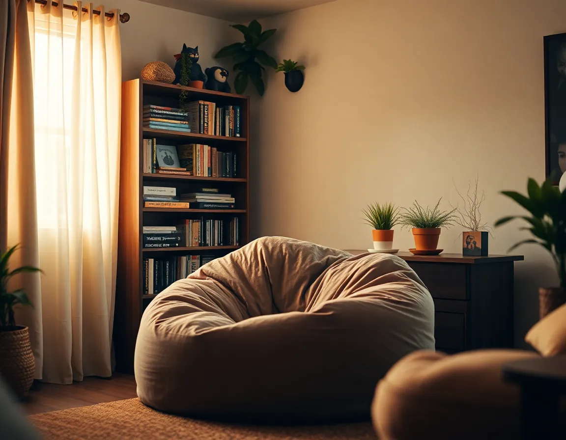 An inviting gaming nook is beautifully captured in warm light, showcasing a plush beanbag chair surrounded by an array of video game memorabilia on an elegant bookshelf. The sunlight filtering through soft curtains creates a cozy ambiance, enhancing the earthy color tones throughout the scene. This tranquil setting exudes comfort and enthusiasm for gaming, making it an ideal spot for relaxation and play. The gentle focus on the beanbag invites viewers to imagine sinking into this perfect retreat for gaming.