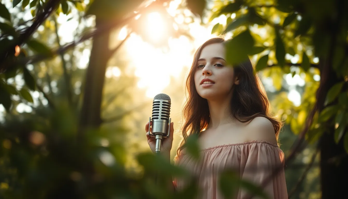 A young woman is captured singing passionately into a vintage microphone amidst a serene outdoor setting, surrounded by lush greenery and softly filtered sunlight. The warm natural light enhances the mood, creating a magical quality that complements her flowing dress. The composition frames her through nearby branches, adding depth and context to the scene. This image portrays the beauty of music and nature, resonating with tranquility and artistic expression.