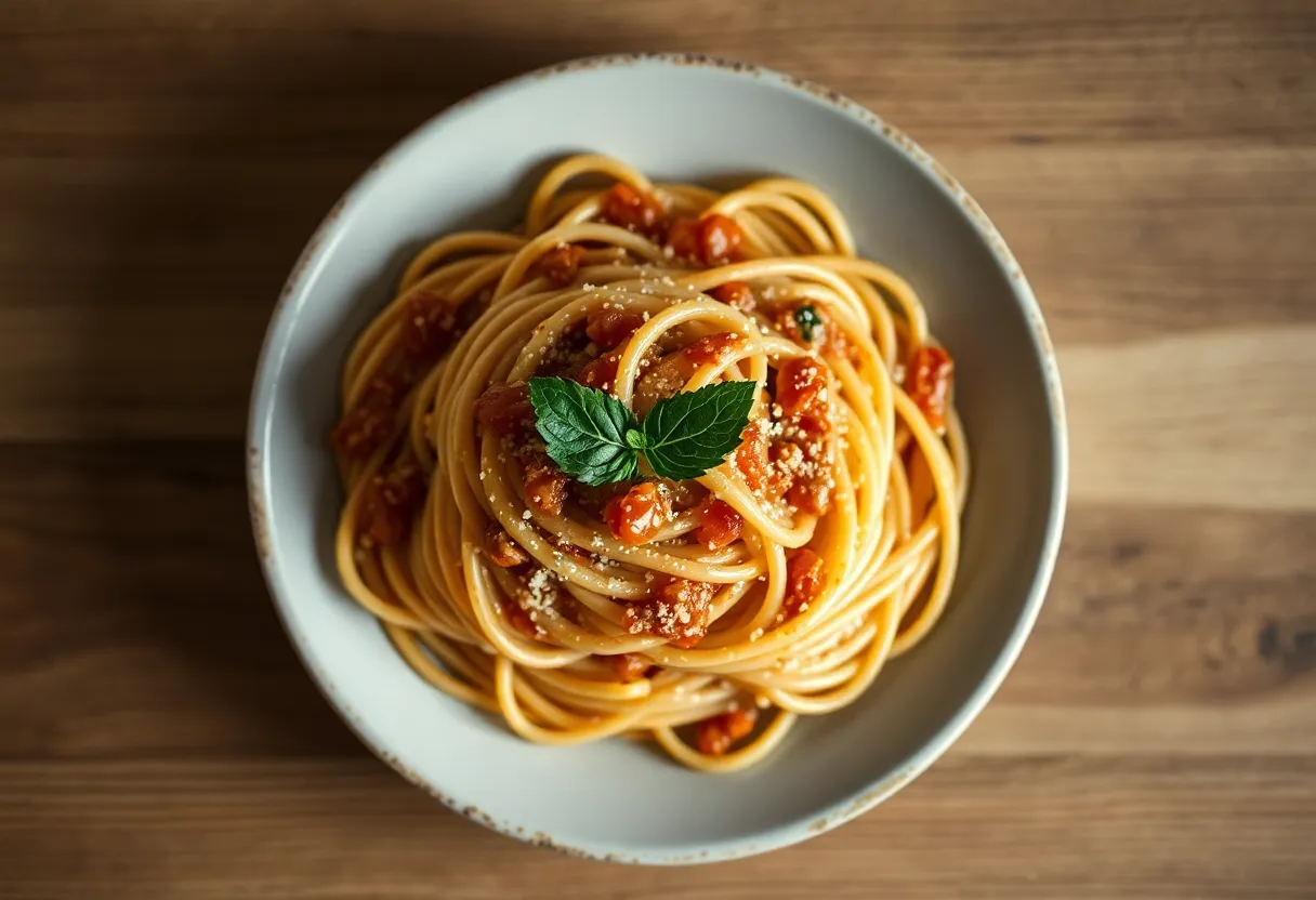 An exquisite artisan pasta dish elegantly plated, surrounded by fresh herbs and sprinkled cheese. The butterfly lighting highlights the textures of the pasta and sauce, while the muted color palette enhances the natural appeal of the meal. This image evokes feelings of warmth and comfort, ideal for showcasing the beauty of homemade cooking. The centered composition invites the viewer to savor the craftsmanship of the dish.