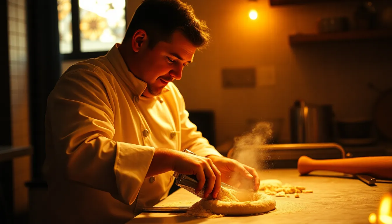 A candid moment captures a chef's hands skillfully mixing dough in a warm, inviting kitchen illuminated by flickering firelight. The soft focus on the hands emphasizes the art of cooking while the warm color palette enhances the cozy atmosphere. Positioned to the left, the chef embodies the heart of homemade cooking, bringing a sense of craftsmanship to the scene.