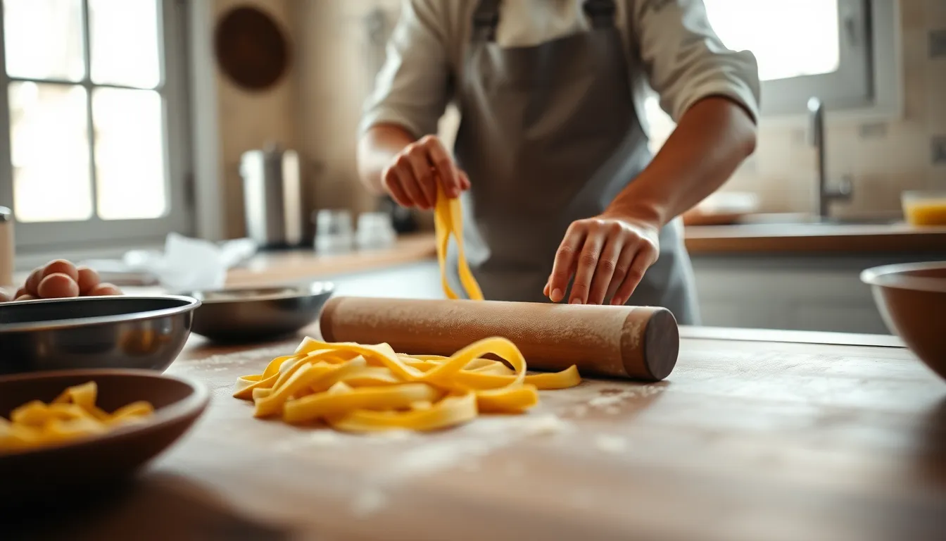 This heartwarming image showcases a chef skillfully preparing homemade pasta in a cozy kitchen. Soft daylight filters through a window, illuminating the wooden countertop where dough is being rolled. The softly blurred background highlights the chef's focused hands, presenting a sense of craft and intimacy. The warm color palette evokes a traditional kitchen atmosphere, inviting viewers to feel the passion of homemade cooking.