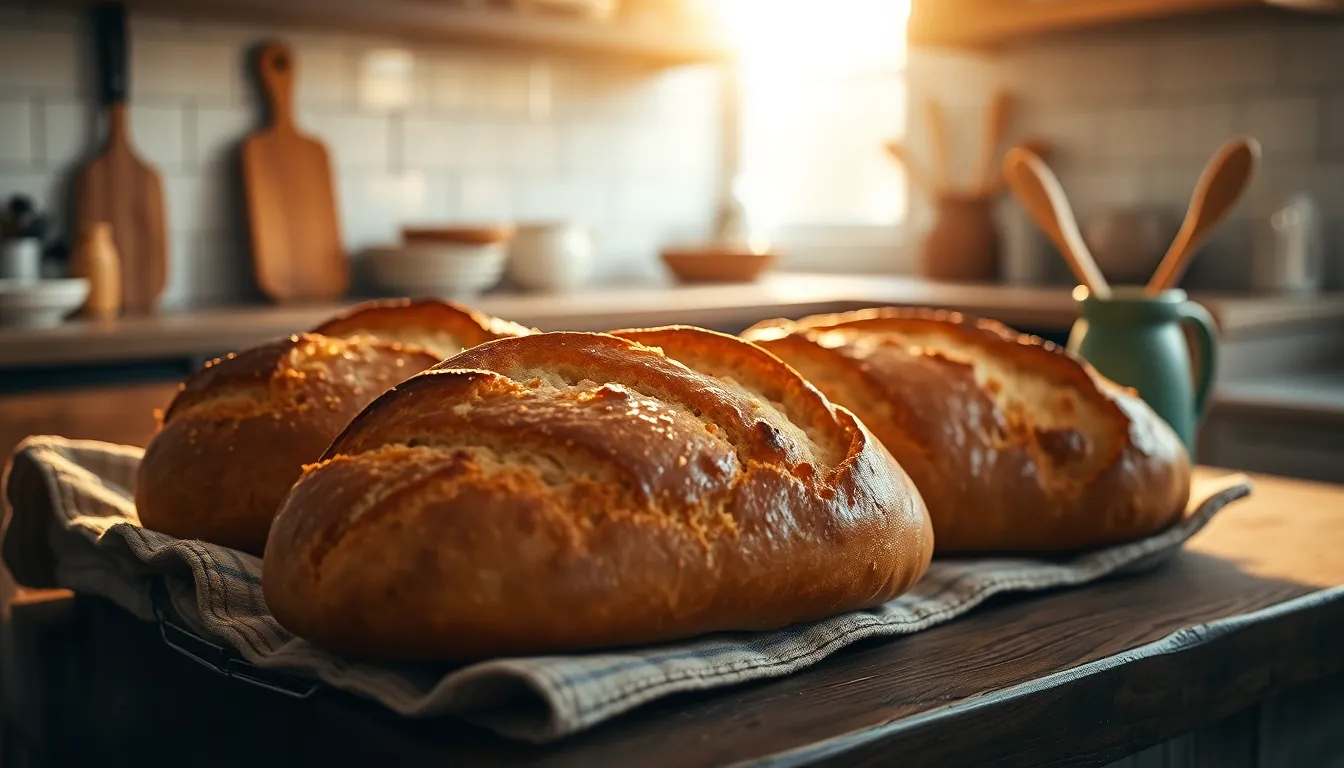 This inviting kitchen scene captures freshly baked bread resting on a rustic wooden table, adorned with earthy tones and soft textures. The golden hour light creates a warm ambiance, accentuating the bread's crispy crust and inviting aroma. Off-centered composition guides the viewer's eye through the cozy kitchen atmosphere, filled with natural materials and homey touches. A perfect visual representation of homemade cooking.