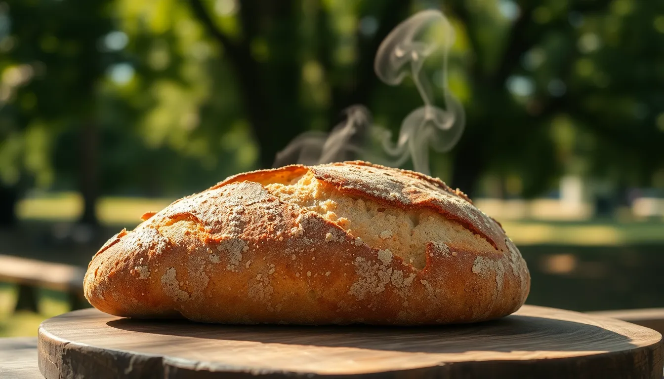 A freshly baked loaf of homemade bread rests on a rustic wooden board, illuminated by dappled sunlight filtering through a tree canopy. The artisanal texture of the crust is beautifully highlighted, with steam gently rising, creating an inviting and warm atmosphere. Soft bokeh enhances the dreamy quality of the background, focusing attention on the tempting details of the bread.