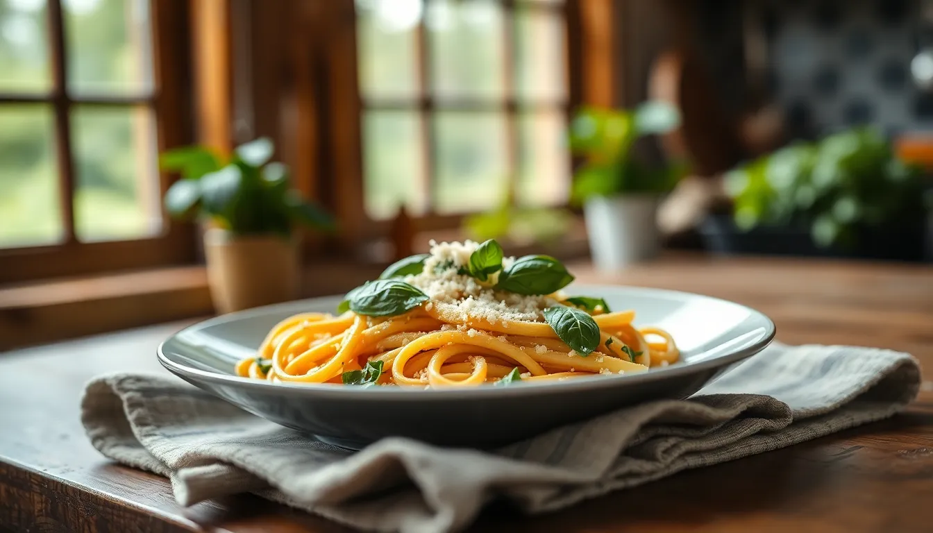 This image captures a stunningly plated dish of homemade pasta in a rustic kitchen setting. The fresh basil and grated parmesan create a vibrant contrast against the creamy pasta and warm wooden table. Soft, diffused daylight filters through the window, casting gentle highlights that enhance the warm tones of the setting. The shallow depth of field draws attention to the dish while providing a soft blur to the inviting background.