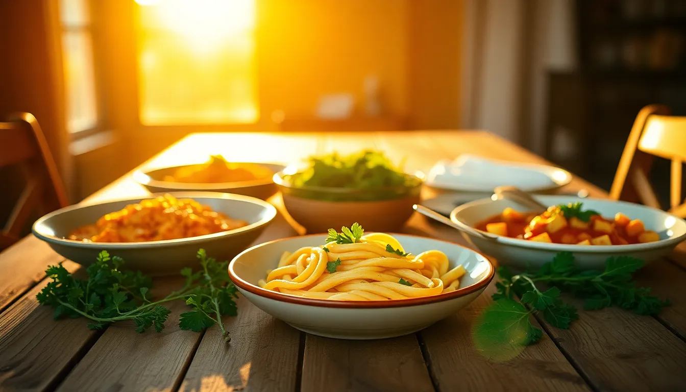 A beautifully arranged spread of homemade pasta dishes sits on a rustic wooden table, illuminated by warm golden hour light. The focus is on the glistening textures of the fresh pasta, vibrant sauces, and fresh herbs, all surrounded by a soft, creamy bokeh. The inviting atmosphere evokes the warmth of home cooking, with the rustic setting enhancing the inviting colors and natural appeal.