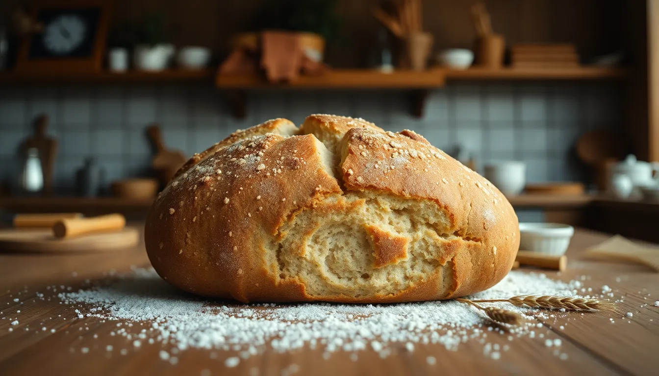 This inviting scene showcases a beautifully baked sourdough bread on a rustic wooden table. Warm tungsten lighting adds a cozy ambiance, highlighting the bread's crusty surface. Surrounding elements like flour and wheat create an authentic homemade feel. The shallow depth of field draws attention to the bread while the blurred kitchen background enhances the homey atmosphere.