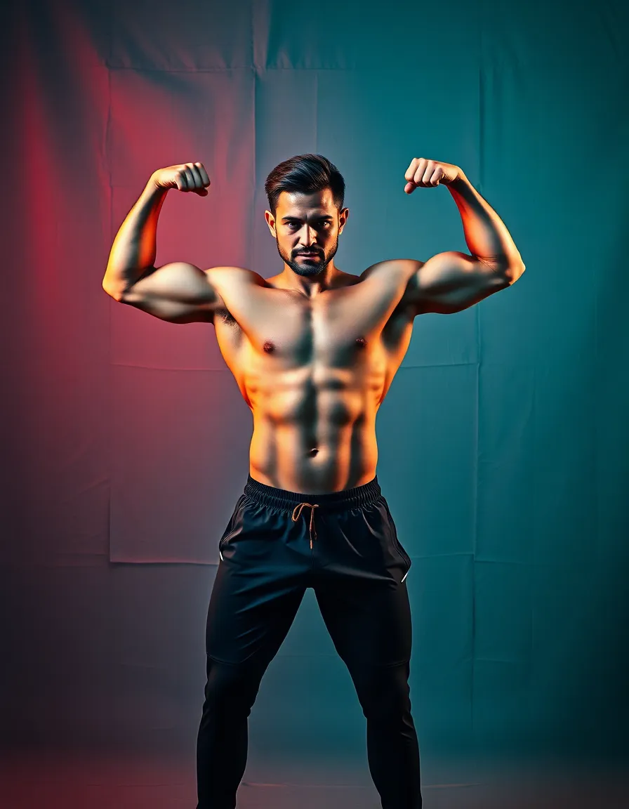 This striking image highlights an athlete powerfully flexing their muscles in a sleek studio environment. The dramatic lighting and teal-orange color grading create an intense atmosphere, accentuating the subject's strength and style. The textures in the backdrop enhance the image's depth, while the focus on the athlete's attire showcases the craftsmanship of modern sportswear. Ideal for fitness and sports marketing campaigns.