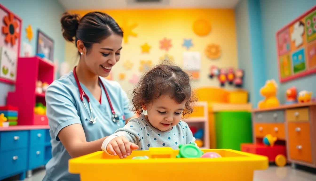 In this heartwarming scene, a pediatric nurse engages playfully with a young child in a bright, cheerful clinic room. The nurse’s warm smile and the child’s laughter fill the space with joy, highlighted by vibrant colors from toys and decorations. The atmosphere is lively and comforting, showcasing the nurturing side of healthcare for younger patients. With careful attention to detail and focus, this image encapsulates the fun and compassionate nature of pediatric nursing.
