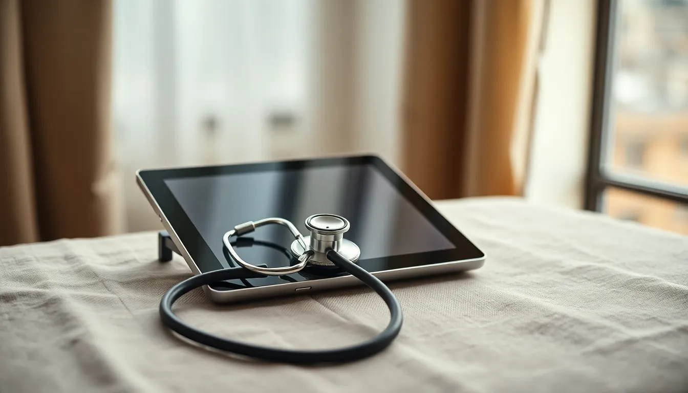 A beautifully arranged display of telemedicine tools, featuring a stethoscope and tablet, rests on a textured fabric background. The soft diffused lighting creates a tranquil atmosphere, while the shallow depth of field isolates the subjects against a gentle bokeh. The natural muted tones evoke a sense of calm, highlighting the simplicity and elegance of modern healthcare technology.