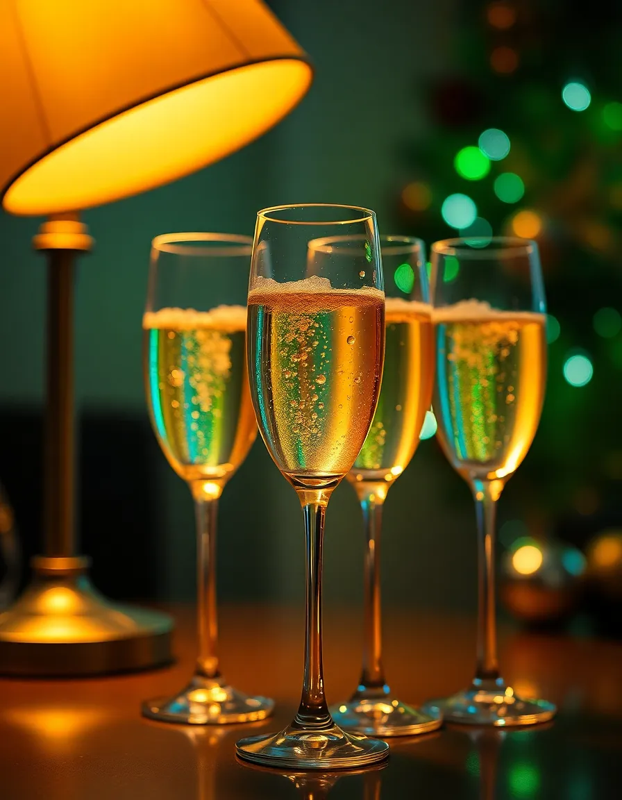 A stunning close-up of elegantly arranged champagne flutes filled with sparkling wine, captured with dynamic Dutch angle for visual interest. The warm light from a tungsten lamp creates a cozy ambiance, highlighting the bubbles rising in the glasses. The rich, saturated colors of the image evoke a sense of celebration and festivity, perfect for New Year's promotions or events. This image encapsulates the excitement and anticipation of toasting to new beginnings.
