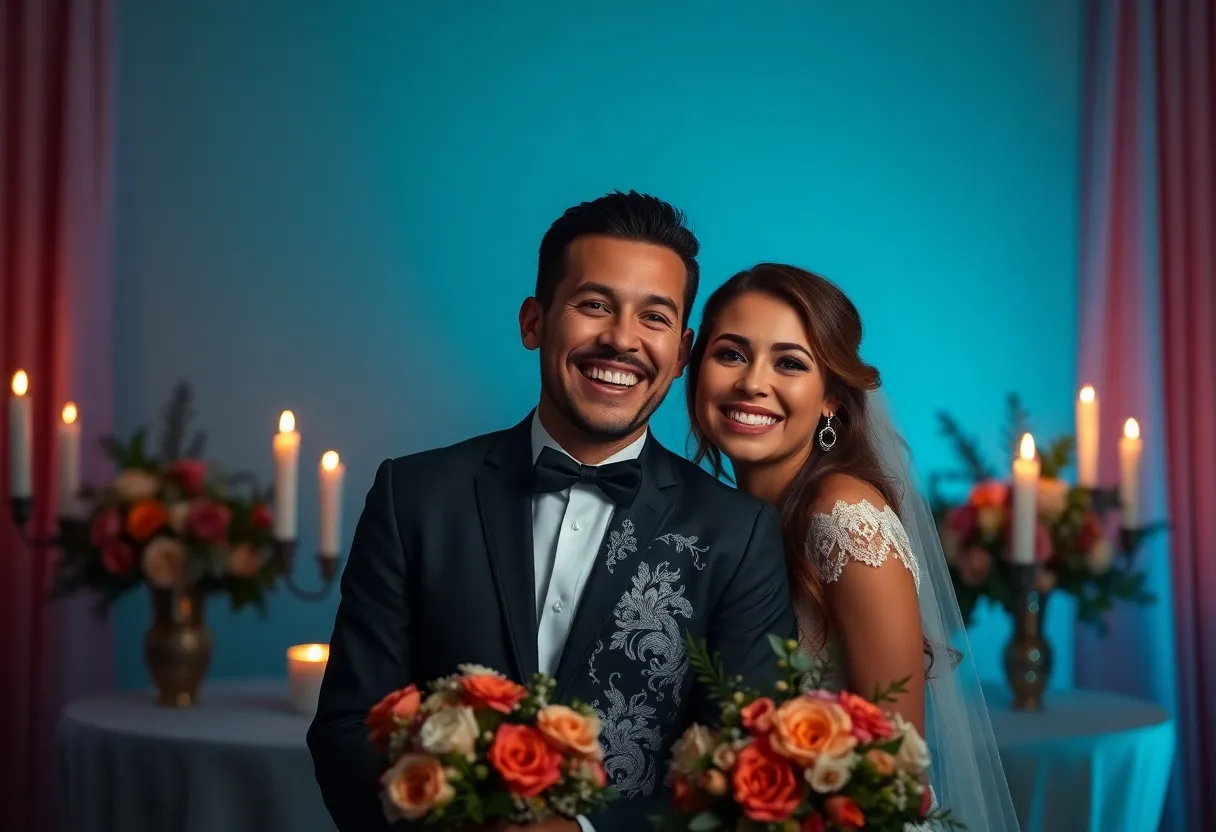 A joyful portrait of newlyweds, radiating happiness as they celebrate their union. The couple's expressions are captured beautifully under warm studio lighting, enhanced by a cinematic color palette that adds vibrancy to the scene. With carefully arranged candles and floral elements surrounding them, the composition creates a sense of intimacy and joy, making this image a perfect representation of love.