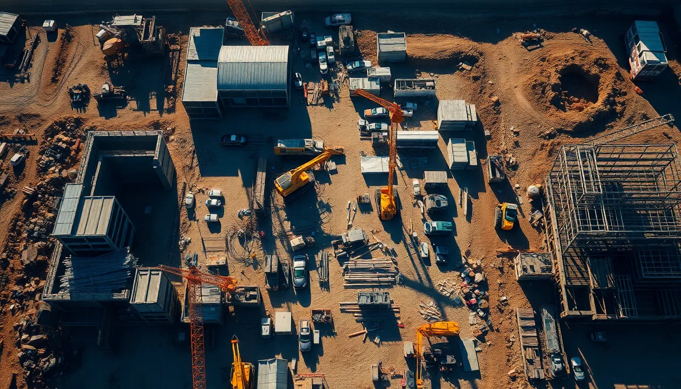An impressive aerial perspective of a construction site bustling with activity captures cranes, trucks, and workers in motion under the glaring midday sun. The sharp shadows and vivid colors of machinery contrast with the natural earth tones of the site, creating an energetic atmosphere. This image conveys the complexities of modern construction approaches, highlighting both the scale and intricacies of engineering in the development process.