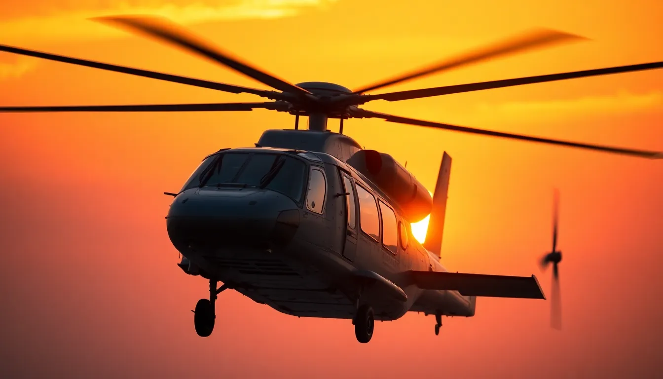 This stunning image showcases a military helicopter soaring through a vivid sunset sky. The warm hues of orange and purple reflect off the helicopter's metallic surface, creating a captivating contrast against the vibrant backdrop. The shallow depth of field sharpens the helicopter while the background blurs beautifully. Leading lines from the rotor blades enhance the dynamic energy of the scene, emphasizing the strength and agility of the aircraft.