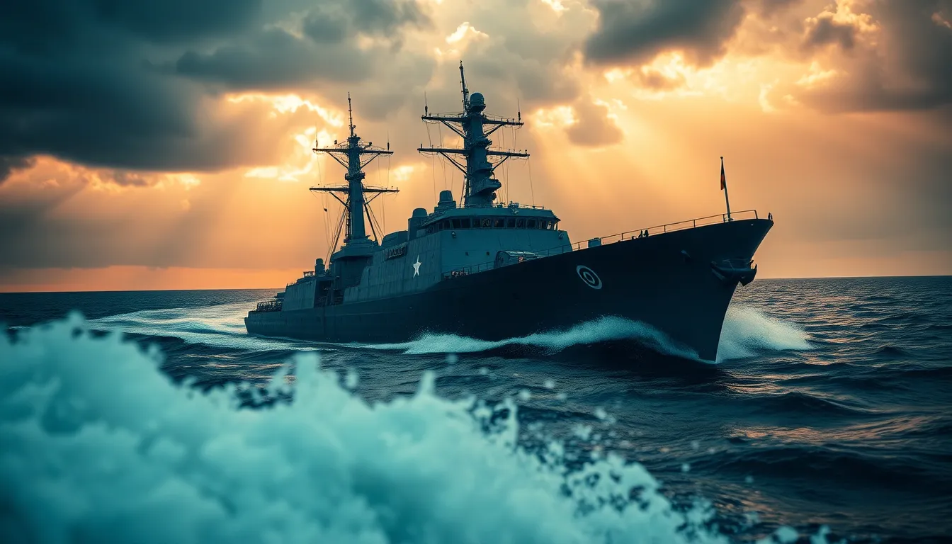 This powerful image depicts a naval destroyer bravely cutting through turbulent waters in the midst of a storm. Dark, brooding clouds loom overhead while beams of sunlight penetrate the sky, creating a dramatic contrast. The keen focus highlights the ship's military features along with the ferocity of the crashing waves, emphasizing the relentless power of nature and technology. The overall atmosphere is one of tension and strength.