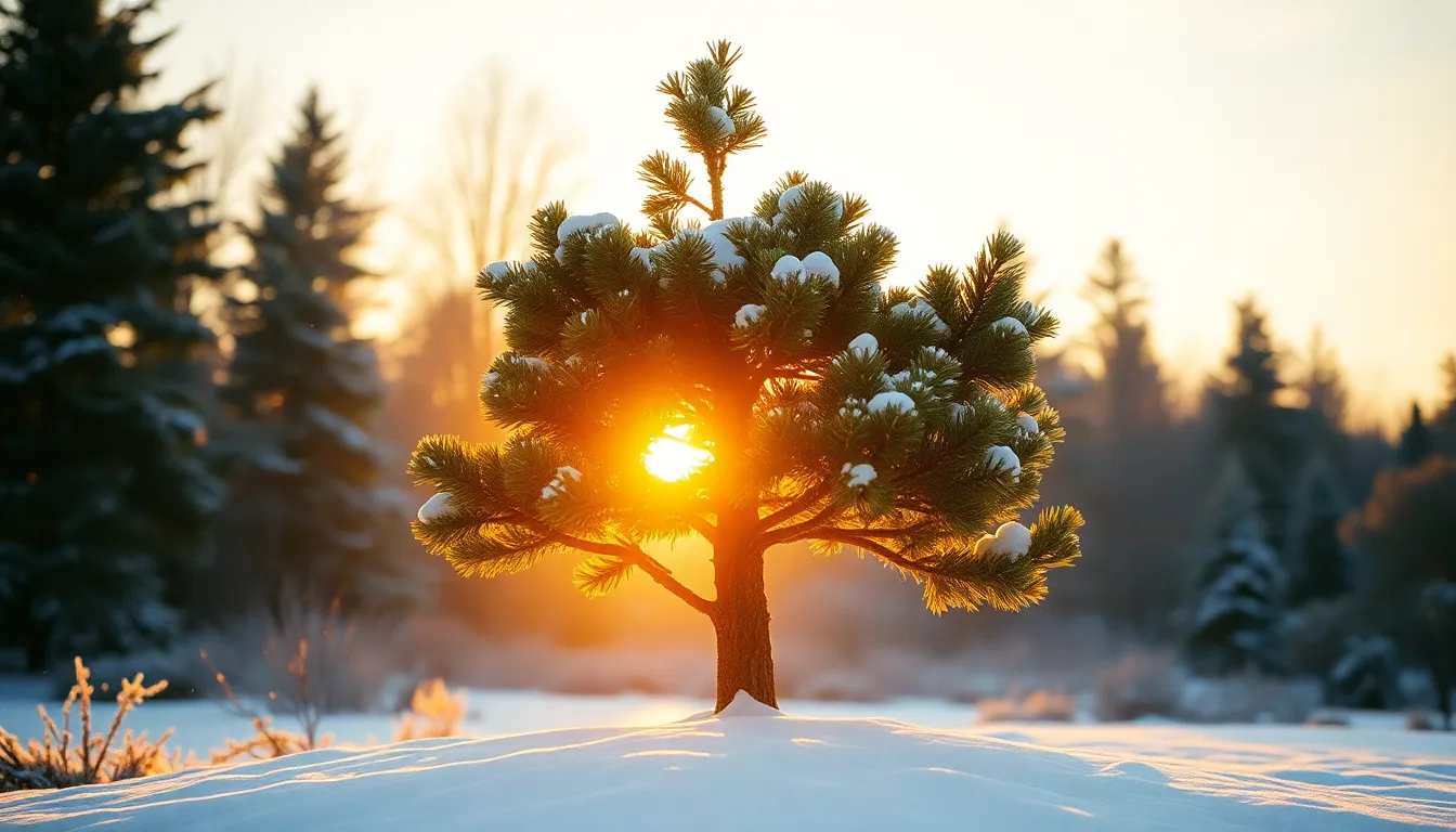 This serene image features a solitary pine tree surrounded by a blanket of fresh snow. The golden hour sunlight creates a warm glow, highlighting the snowflakes as they gracefully fall. The soft, creamy bokeh in the background draws attention to the rough texture of the pine's bark against the delicate snow. A peaceful winter mood is evoked, making this image ideal for seasonal themes.
