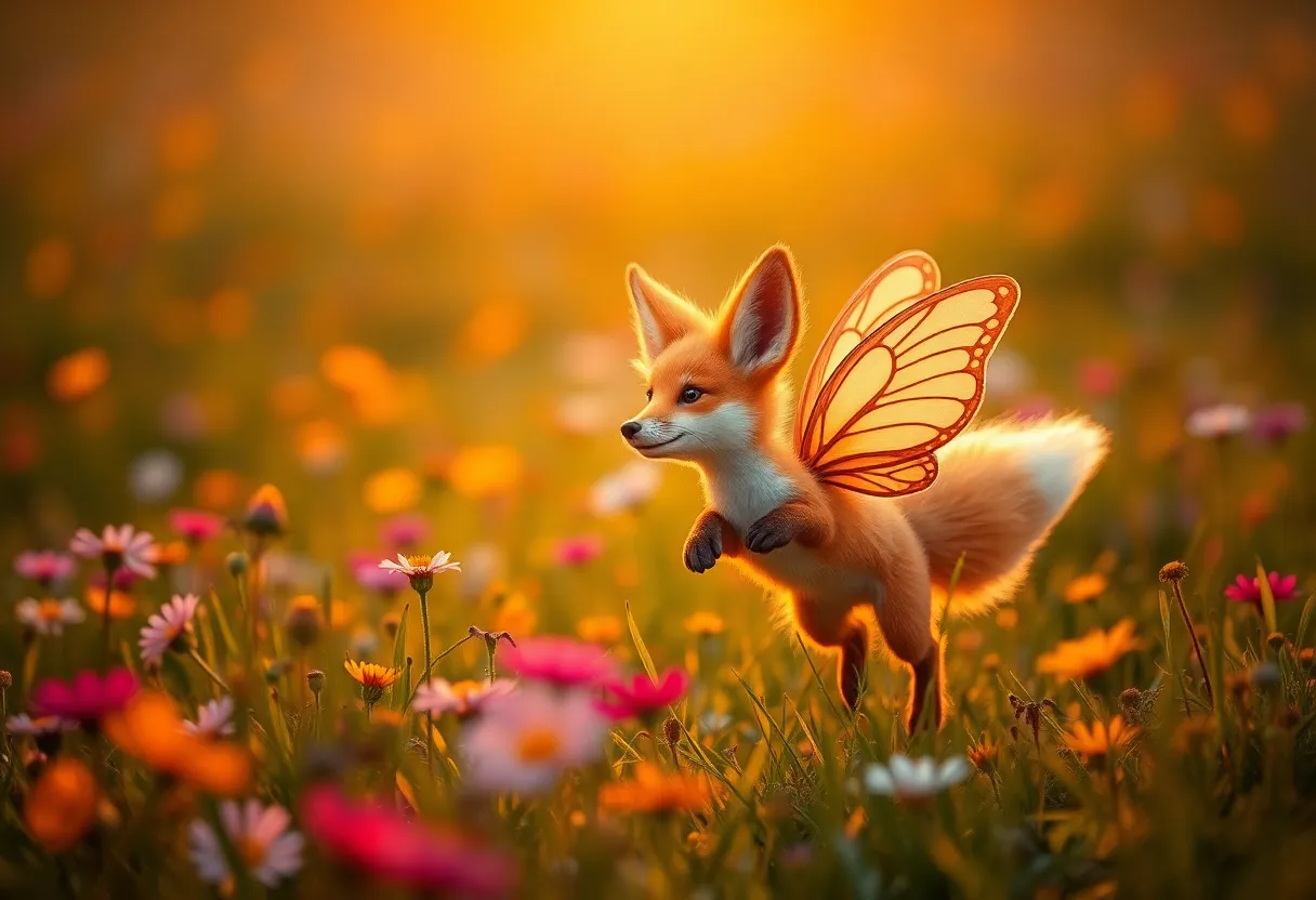 This delightful image showcases a fantasy fox with butterfly wings joyfully frolicking in a blooming meadow at golden hour. The warm rim lighting highlights the creature's vibrant colored fur and wings. A shallow depth of field creates a dreamy bokeh effect, enhancing the colorful wildflowers that surround it. This whimsical scene radiates joy and enchantment, inviting viewers into a magical landscape.