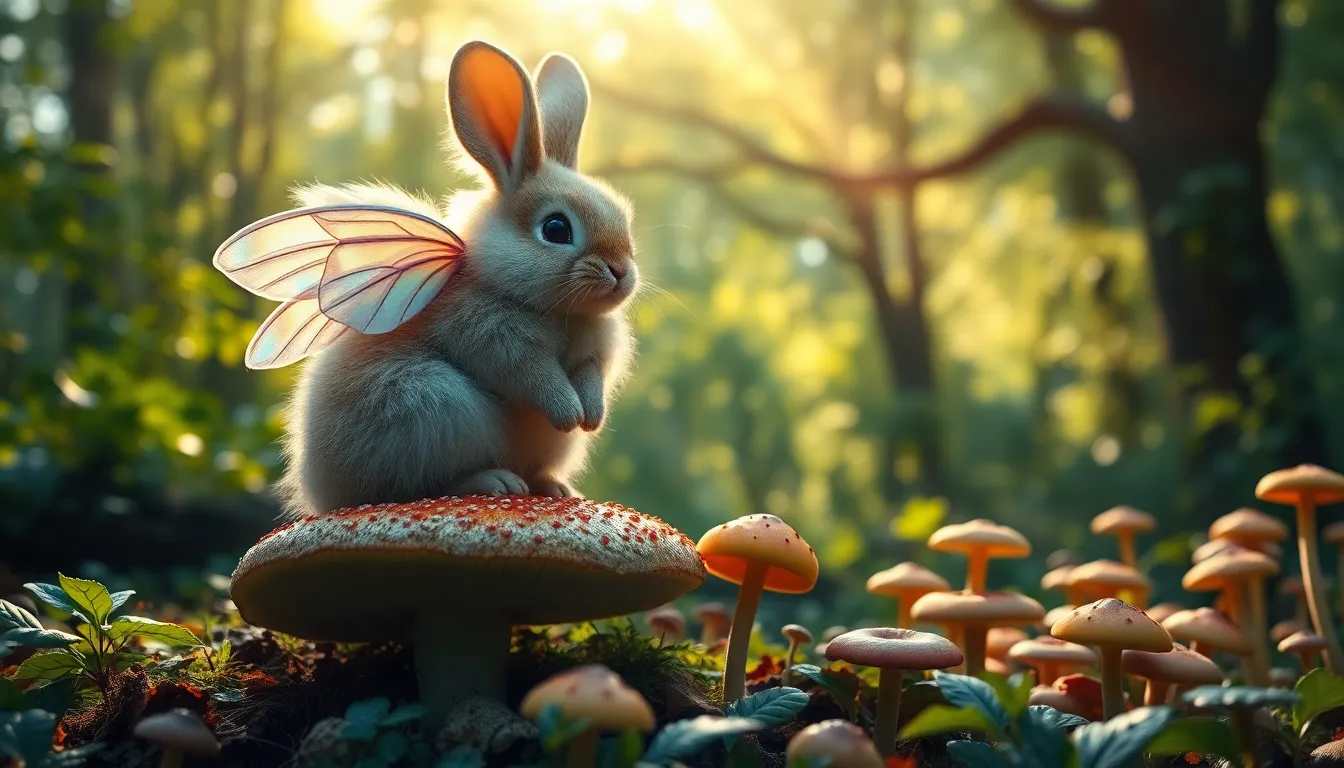 This enchanting image features a giant, fluffy rabbit adorned with iridescent wings, perched atop a vibrant mushroom in a lush forest. The soft, dappled sunlight filters through the canopy, casting a magical glow on the scene. Rich greens and warm earth tones evoke a whimsical atmosphere, while the shallow depth of field draws attention to the intricate details of the creature and its surroundings. A perfect composition that captures the essence of a fairy-tale setting.