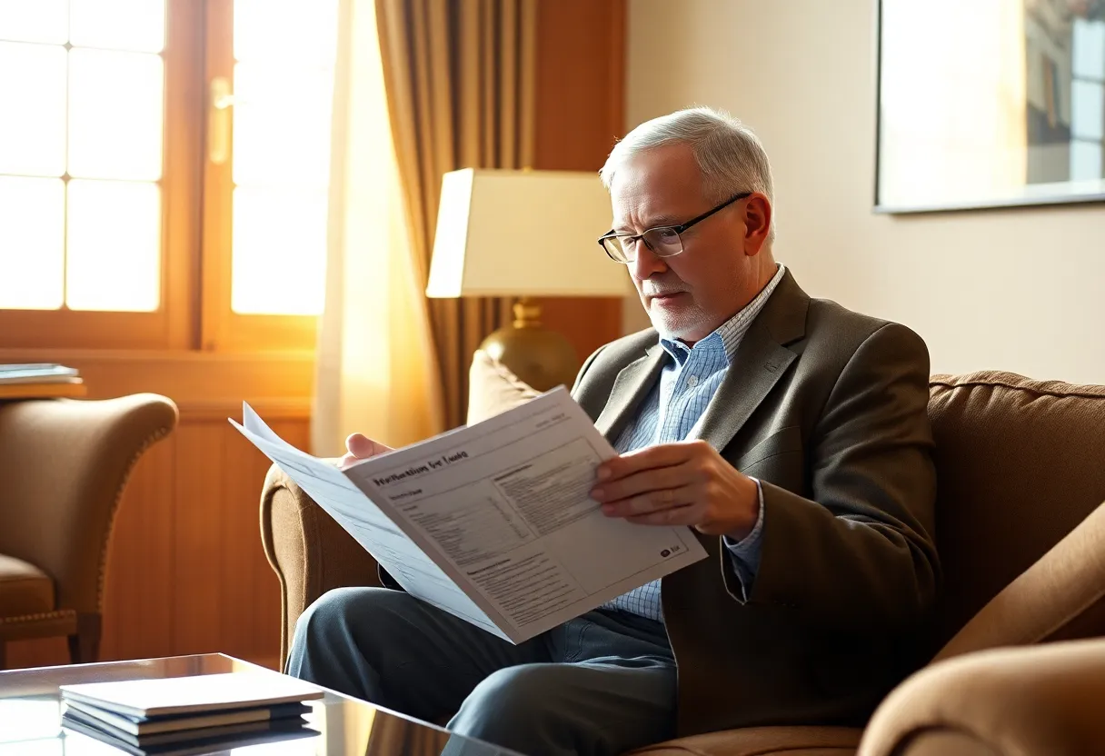 This image captures an elderly investor thoroughly reviewing a financial brochure in a thoughtfully arranged living space. Warm daylight streams through the window, creating soft highlights that compliment the rich textures of the wooden furniture and fabric. The hyperfocal depth of field keeps the entire scene in crisp detail, while the Kodak Portra 400-inspired color palette adds softness to the skin tones of the investor. Leading lines guide the viewer's eye directly to the subject, emphasizing contemplation in investment decision-making.