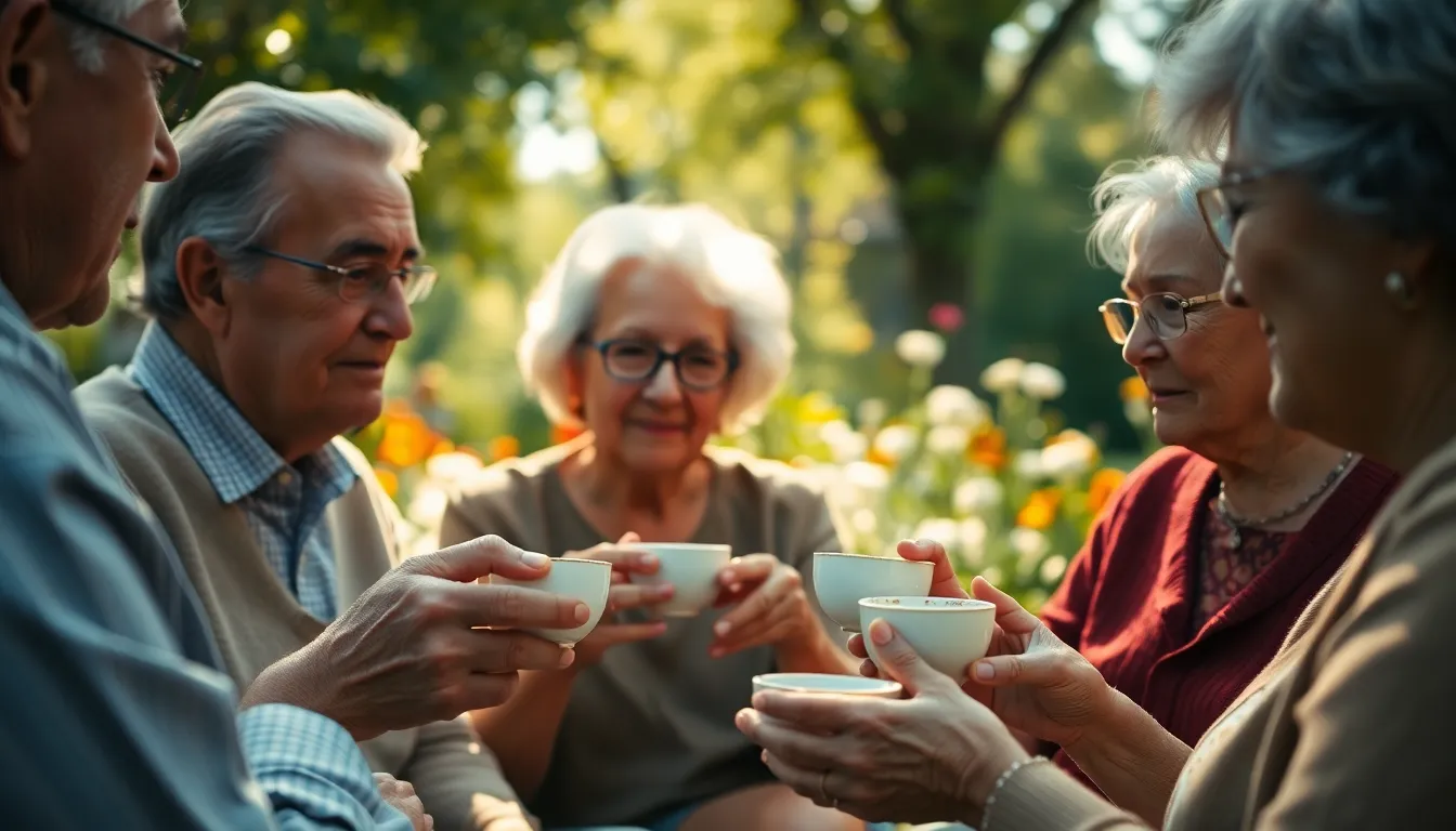 This serene image portrays a group of elderly friends gathered around a small table, sharing tea and conversation in a vibrant garden setting. Warm afternoon light bathes the scene, creating a peaceful and intimate atmosphere accentuated by soft floral colors in the background. The focus is on their warm expressions and the textures of their teacups and surroundings, evoking a sense of nostalgia and companionship. This photograph beautifully captures the essence of friendship in later life.
