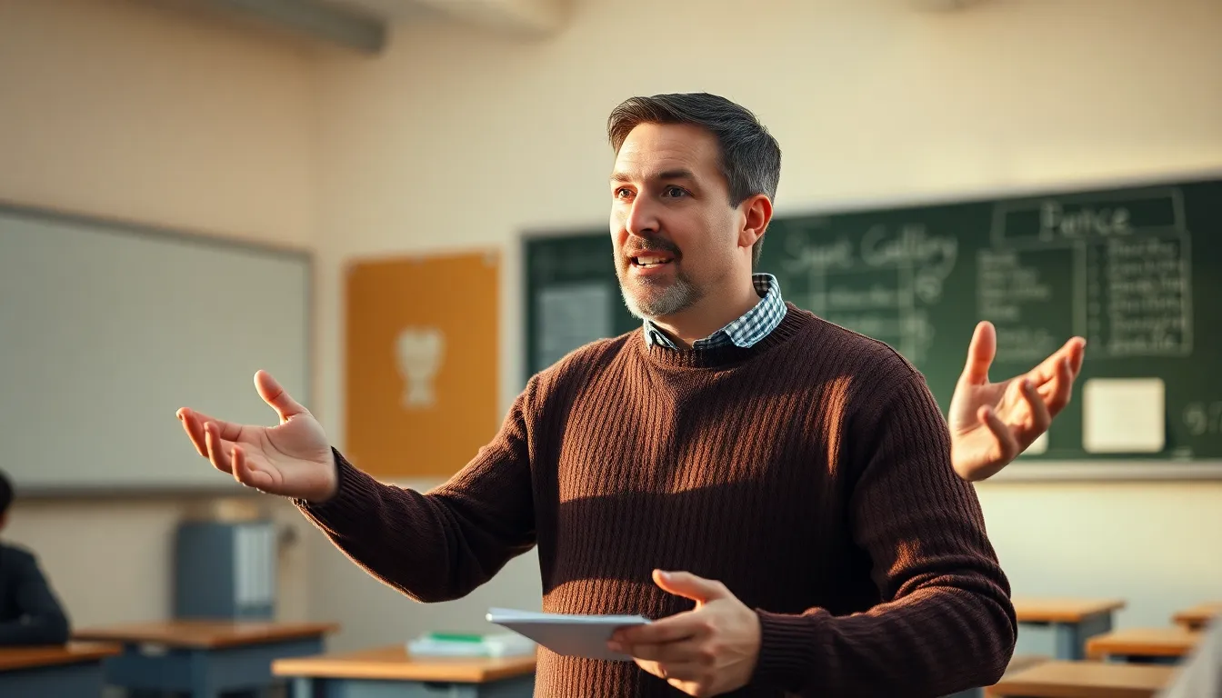 During golden hour, a passionate male teacher is depicted engaging with his students in a warmly lit classroom. The rim light accentuates his vibrant gestures, creating a dynamic atmosphere that invites learning. The muted earthy tones of the classroom blend harmoniously, enhancing the focus on him as the central figure, while textures of his cozy sweater and educational materials add to the image's richness.