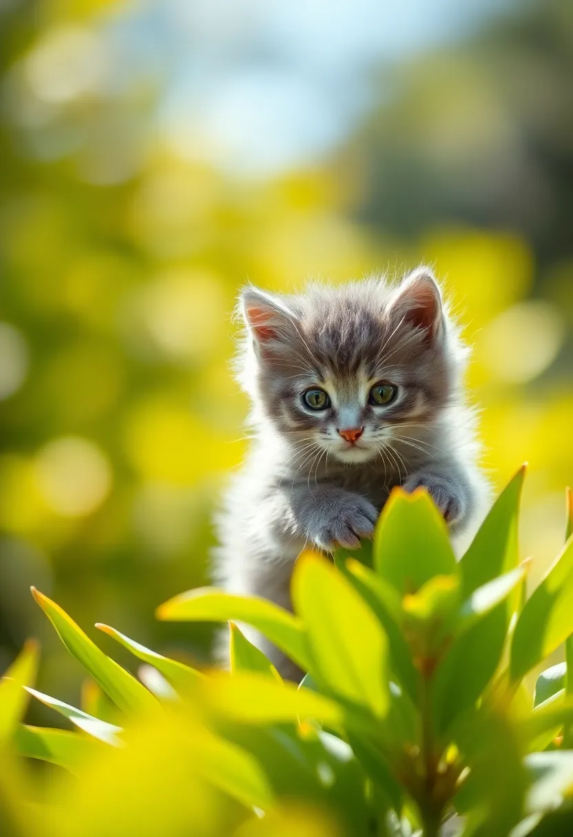 This dynamic image captures an adventurous gray kitten energetically climbing a vibrant green plant, embodying curiosity and playfulness. Bright, diffused daylight enriches the colors, creating a lively atmosphere. The soft bokeh background beautifully contrasts with the kitten's fluffy fur, while leading lines from the plant direct attention to its playful pose.