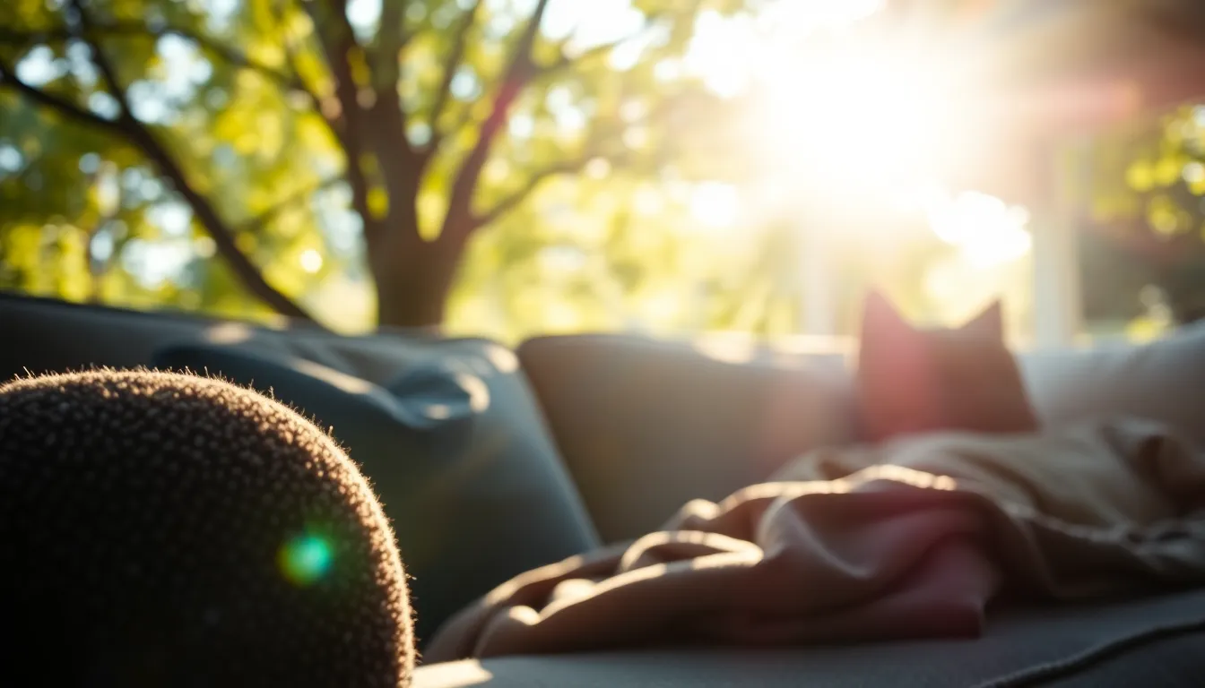 An inviting plush sofa decorates a sunlit living room, with dappled sunlight filtering through trees and creating enchanting bokeh highlights in the background. The photograph captures the rich textures and layers of fabrics, inviting one to sink into the comfort it offers. The vibrant colors and soft focus harmonize to evoke a feeling of warmth and relaxation, making the space feel alive.
