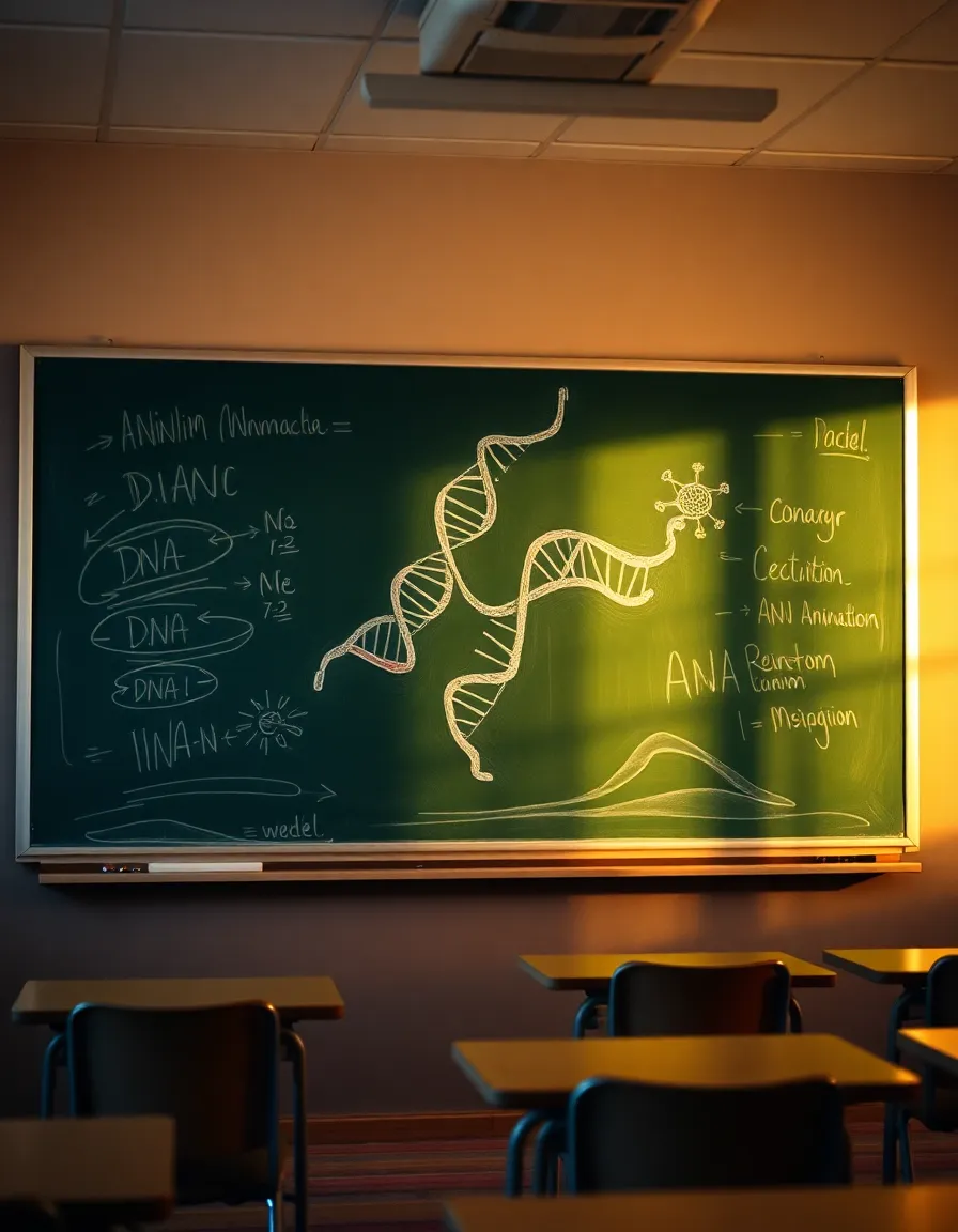 This engaging image showcases a vibrant illustration of a DNA structure on a classroom chalkboard, illuminated by warm tungsten light that adds depth and warmth. The focus remains sharp on the illustration, while the classroom setting gradually fades into a soft blur. The use of color in the chalk brings life to the educational environment, creating an atmosphere of creativity and learning. This image is perfect for educational resources or promotional materials in scientific fields.