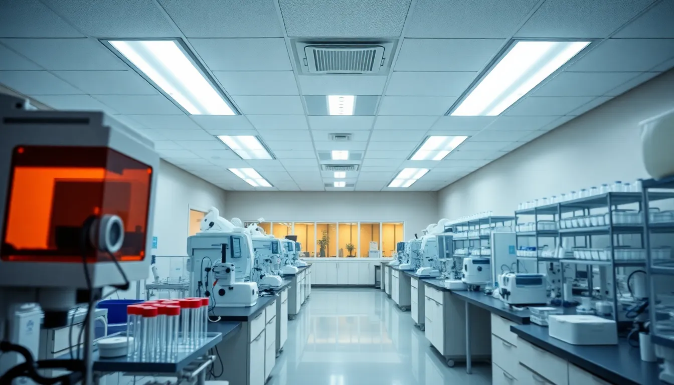 This image captures the essence of a modern medical laboratory filled with high-tech equipment and meticulously arranged test tubes. Overhead fluorescent lighting provides a cool, clinical look, while the sharp focus highlights the precision of the environment. Symmetrical composition enhances the sense of order, making it an ideal representation of scientific rigor and professionalism.