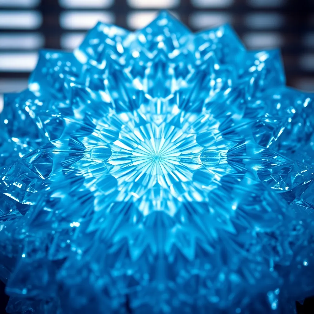 This macro photography image reveals the mesmerizing details of a crystal lattice structure. Illuminated by soft daylight, the facets reflect light in stunning shades of blue and white, showcasing the complexity of the natural form. With the background gently obscured, the focus remains on the intricate patterns of the crystal, creating an otherworldly feel. This image not only highlights the beauty of physics in nature but also serves as an excellent educational resource about crystal structures.
