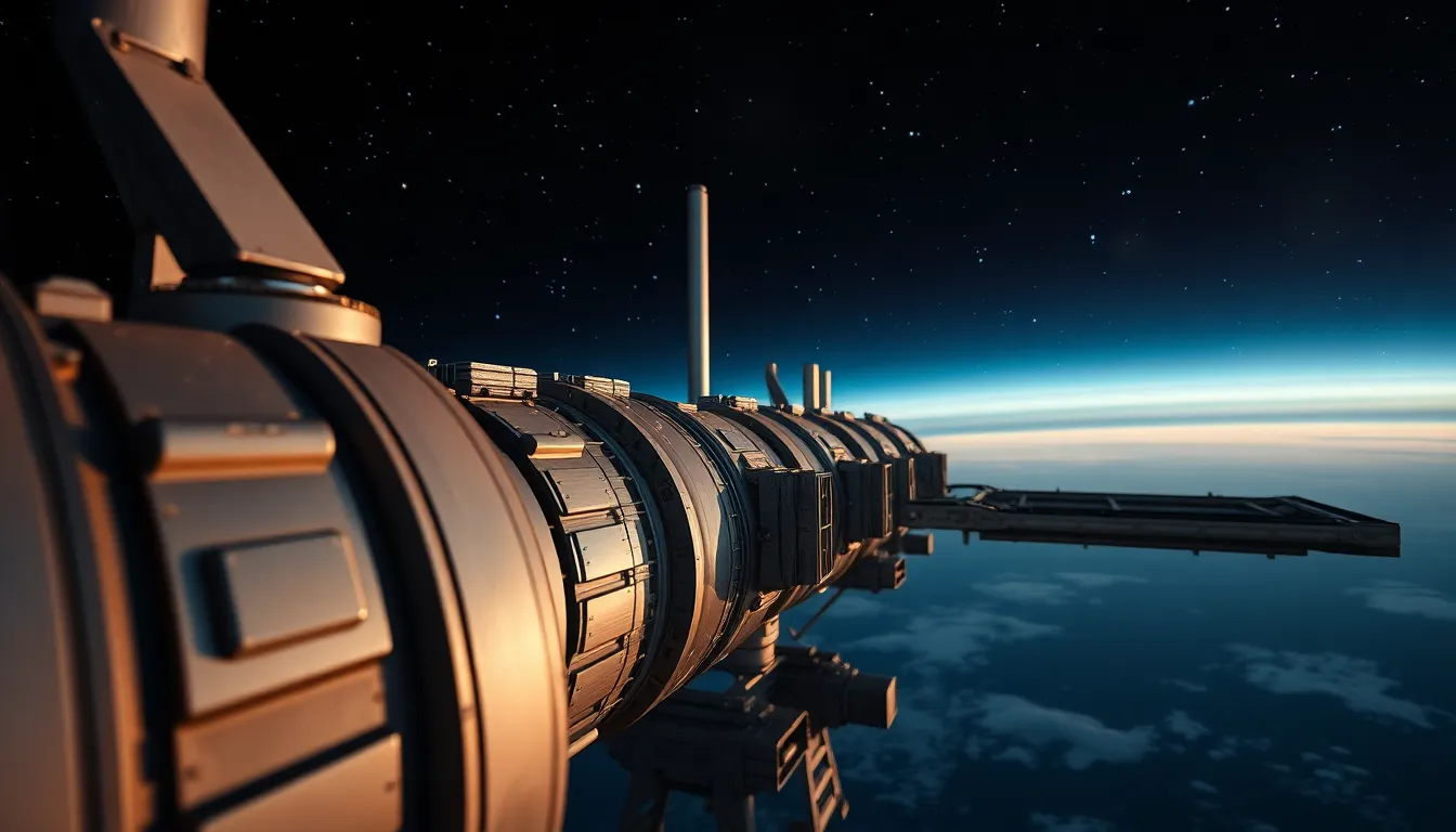 This immersive image illustrates the intricate docking ports of a space station captured during the serene dawn. Soft diffused daylight casts gentle shadows, revealing the metallic textures in stunning detail. The composition adheres to the rule of thirds, drawing attention to the ports while allowing the expansive starry sky to frame the scene. The muted tones enhance the realism, evoking a sense of tranquil exploration in outer space.