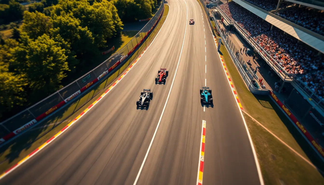 This captivating aerial image highlights a Formula 1 circuit bustling with activity under the bright sun. The vibrant colors of the racing cars pop against the rich green landscape and the sleek black asphalt of the track. Utilizing a tilt-shift effect, the composition gives a playful sense of scale while showcasing the intricate layout of the circuit and the spectators surrounding it. Warm sunlight and shadows enhance the texture of the surface, drawing the viewer's attention to the exhilarating sport of Formula 1 racing.