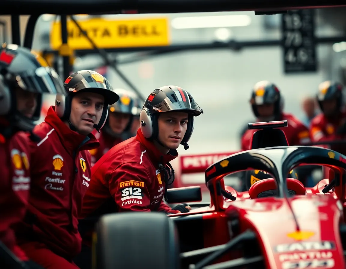 This dynamic photograph showcases a bustling Formula 1 pit crew during a critical pit stop, their faces illuminated by dramatic Rembrandt lighting. The image captures the intense focus and energy of the team as they work in unison. With a shallow depth of field, the crew remains sharp against a softly blurred background. The bold colors of their uniforms and branding contrast with the sleekness of the car, emphasizing the high-pressure environment of motorsport. The composition effectively highlights teamwork and the rush of a pit stop.