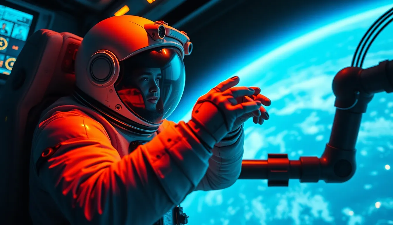 This dynamic image shows an astronaut engaging with a robotic arm in low Earth orbit, illuminated by the vibrant glow of control panel lights. The neon reflections on the space suit create a striking visual contrast, while the shallow depth of field keeps the robotic arm sharp and the background softly blurred. The cinematic color grading amplifies the futuristic feel, and the Dutch angle composition adds a sense of action and urgency to the scene.