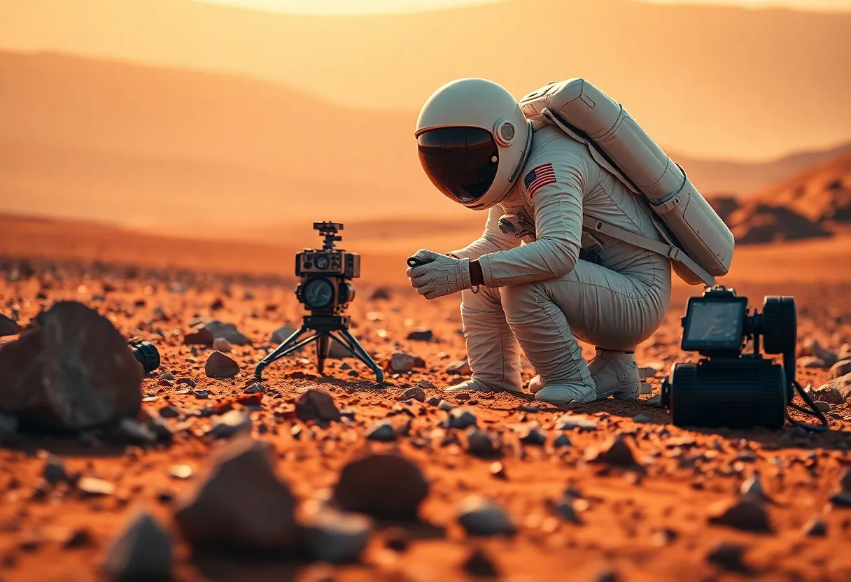 This image showcases an astronaut diligently conducting a science experiment on the Martian surface, surrounded by the iconic red soil and rocky landscape. The gentle natural light casts a warm glow, enhancing the textures of the Martian terrain. The astronaut’s focused expression emphasizes the significance of exploration and discovery in this alien environment. This captivating scene illustrates the human spirit of curiosity and the quest to understand our universe.