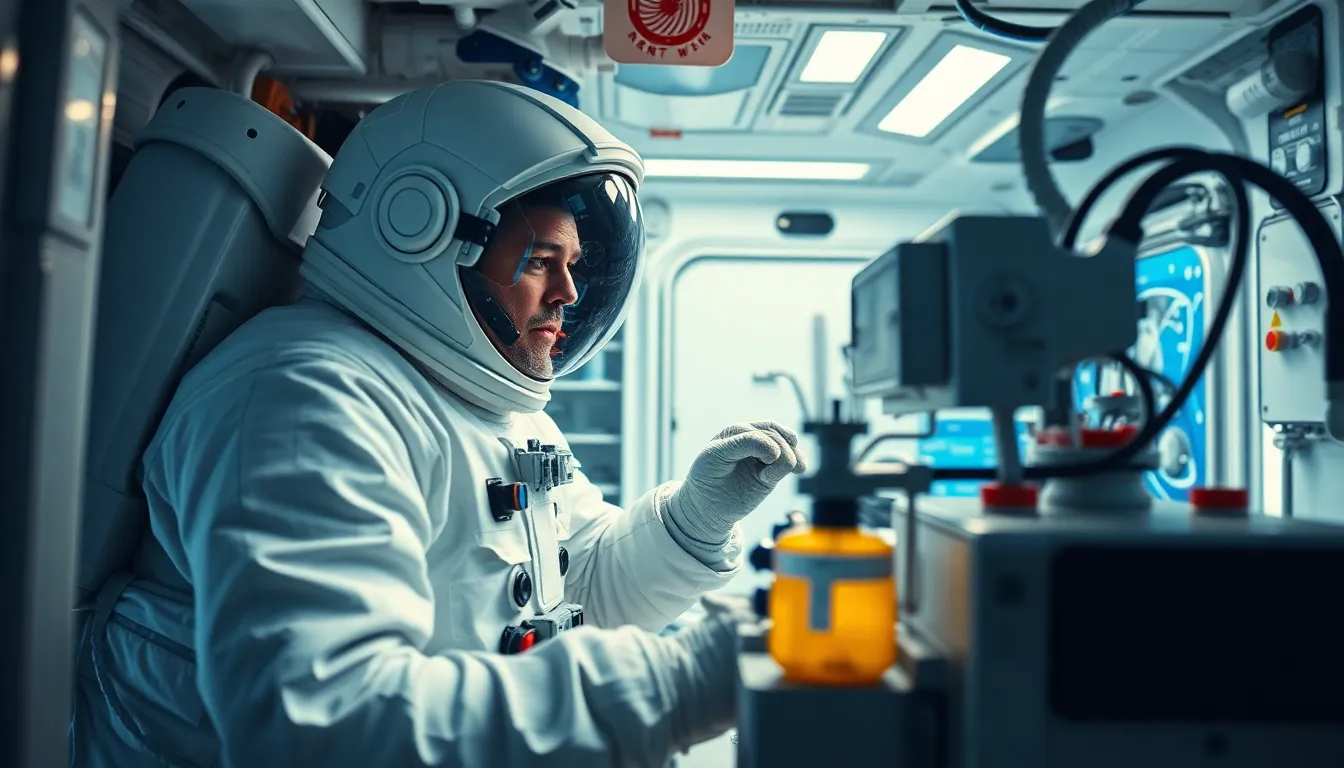 This vibrant image captures an astronaut immersed in scientific work inside a state-of-the-art space laboratory. Bright artificial lighting accentuates the intricate details of the high-tech instruments surrounding them. The astronaut's focused expression underscores the dedication to research in microgravity. The bold color palette of whites and blues emphasizes the advanced technology integral to space exploration.