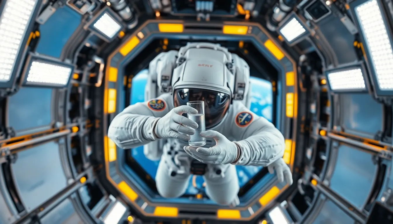 In this captivating image, an astronaut is seen conducting research aboard the International Space Station. Captured in stunning detail, the scene is bright and well-lit with LED lights reflecting off the metallic surfaces, adding a hi-tech feel. The sharp focus captures both the astronaut and the tools floating nearby, as well as the breathtaking view of Earth through the window. The color palette blends cool blues and warm yellows, creating a dynamic ambiance that highlights the astronaut's work in low gravity.
