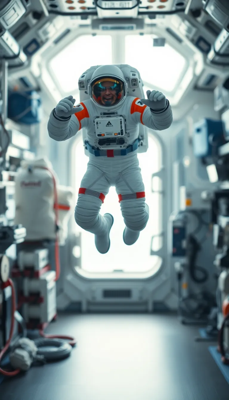 This dynamic image depicts an astronaut floating in microgravity, performing an exercise routine within a high-tech space station. The soft, diffused daylight creates an ethereal glow around the astronaut, highlighting the sleek design of the suit and the vibrant exercise equipment. The shallow depth of field adds a sense of motion, enhancing the feeling of weightlessness and activity in the confined space of the station. The cool color palette further emphasizes the advanced technological environment.