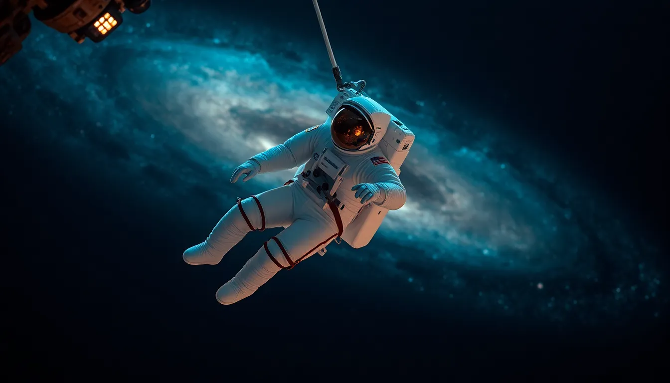 An astronaut gracefully floats in the vastness of space, tethered to their spacecraft with a breathtaking view of the galaxy behind. The illumination from the spacecraft highlights the astronaut's suit, creating a striking contrast against the dark backdrop. The ethereal colors evoke a sense of wonder and isolation, while the blur of stars adds to the dreamlike quality of the scene.