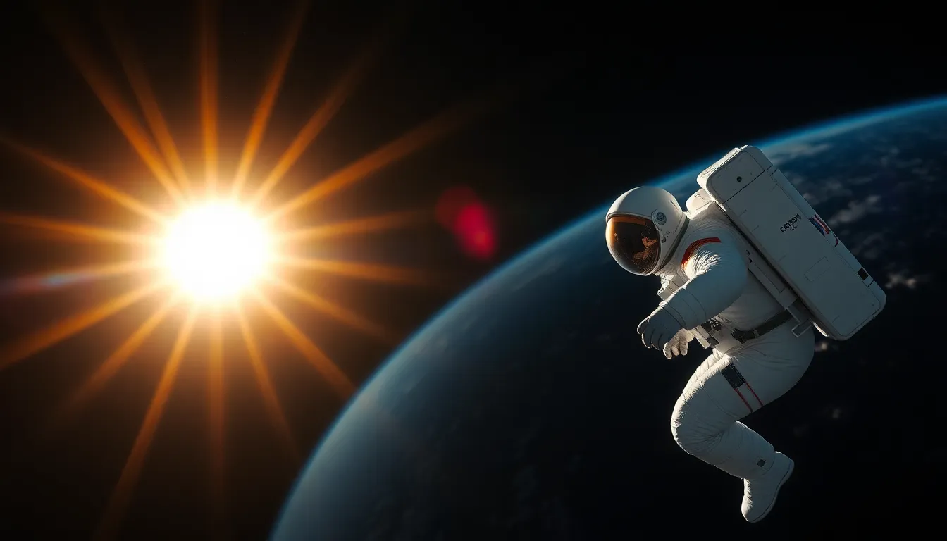 This captivating image depicts an astronaut floating in the vastness of space, dramatically illuminated by sunlight. The vibrant colors of Earth create a stunning contrast against the expanse of black space, emphasizing the astronaut's solitude. The composition draws the viewer's eye through effective use of the rule of thirds, highlighting the interaction between the astronaut and their home planet. This reflective scene evokes feelings of wonder and exploration.