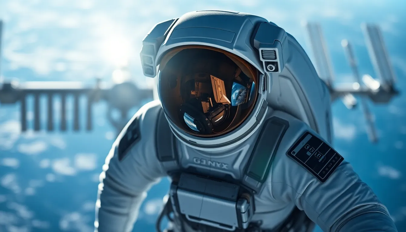 In this dramatic scene, an astronaut is seen floating effortlessly in space, with the International Space Station in the background. The sunlight highlights the reflective surface of the astronaut's helmet, showing Earth's curvature and atmospheric hues. The sharp contrasts between the dark space and the brightly lit suit create a sense of isolation and exploration. With a focus on the minute details of the astronaut's gear, this image encapsulates the wonder of human space exploration.