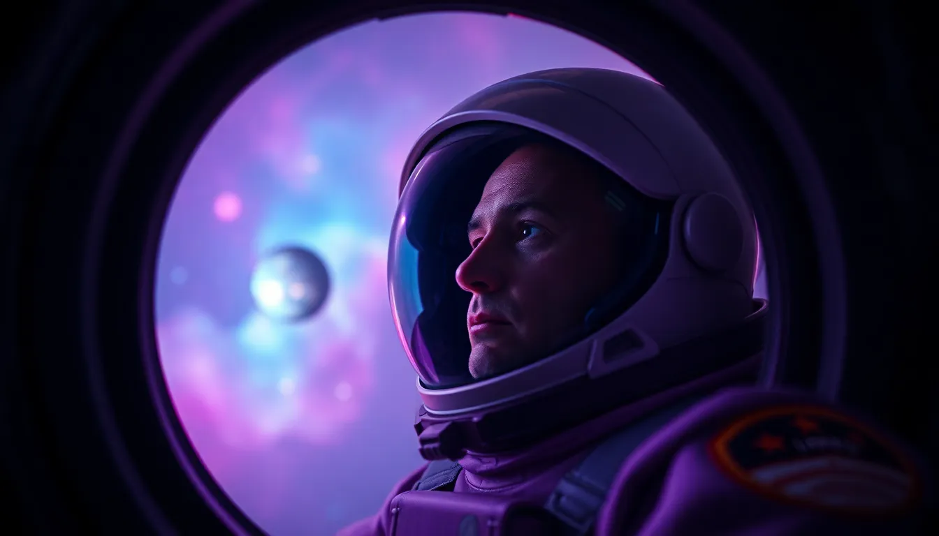 This enchanting image features an astronaut gazing out of a porthole, captivated by the breathtaking view of a distant nebula. The soft, colorful light from the nebula bathes the cabin in an otherworldly glow, enhancing the astronaut's reflective pose. The dreamy hues create a serene and mystical atmosphere, inviting viewers to ponder the wonders of the universe. This composition beautifully illustrates the human connection to the expansive cosmos and the allure of exploration.